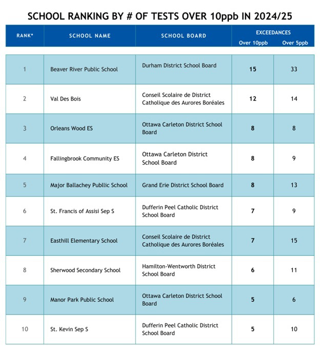 The report uses provincial data to rank the school boards and individual schools that had the highest number of lead tests exceeding 10ppb in 2024/25, but notes that the true scope of the problem is likely being underreported.