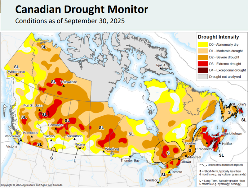 In Ontario, short-term dryness has led to the expansion of drought conditions in September. In southern Ontario Abnormally Dry (D0) and Moderate Drought (D1) expanded. Eastern Ontario saw the expansion of Severe Drought (D2), additionally three new pockets of Extreme Drought (D3) emerged north of Orilla, north of Peterborough and from Kingston towards Ottawa. Eastern Ontario faced critically low water supplies, prompting Level 3 low-water advisories across several watersheds and urging residents to reduce their water use by half.