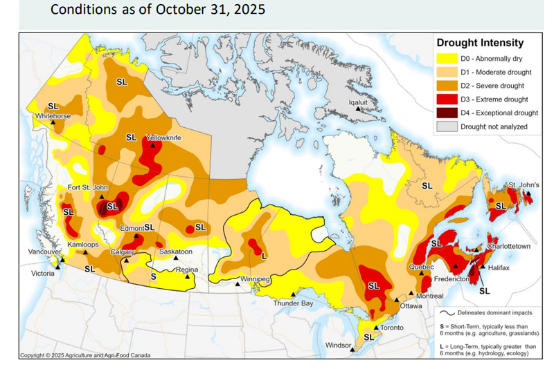 However, significant droughts remain in areas north of the Greater Toronto Area, including Barrie,Kingston, and Ottawa, where Severe Drought (D2) and pockets of Extreme Drought (D3) persist. Severe impacts continue in drought-affected agricultural zones.