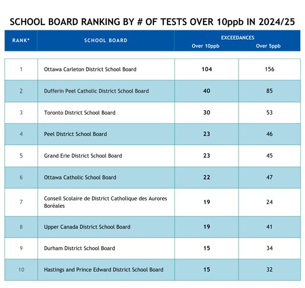 The report uses provincial data to rank the school boards and individual schools that had the highest number of lead tests exceeding 10ppb in 2024/25, but notes that the true scope of the problem is likely being underreported.